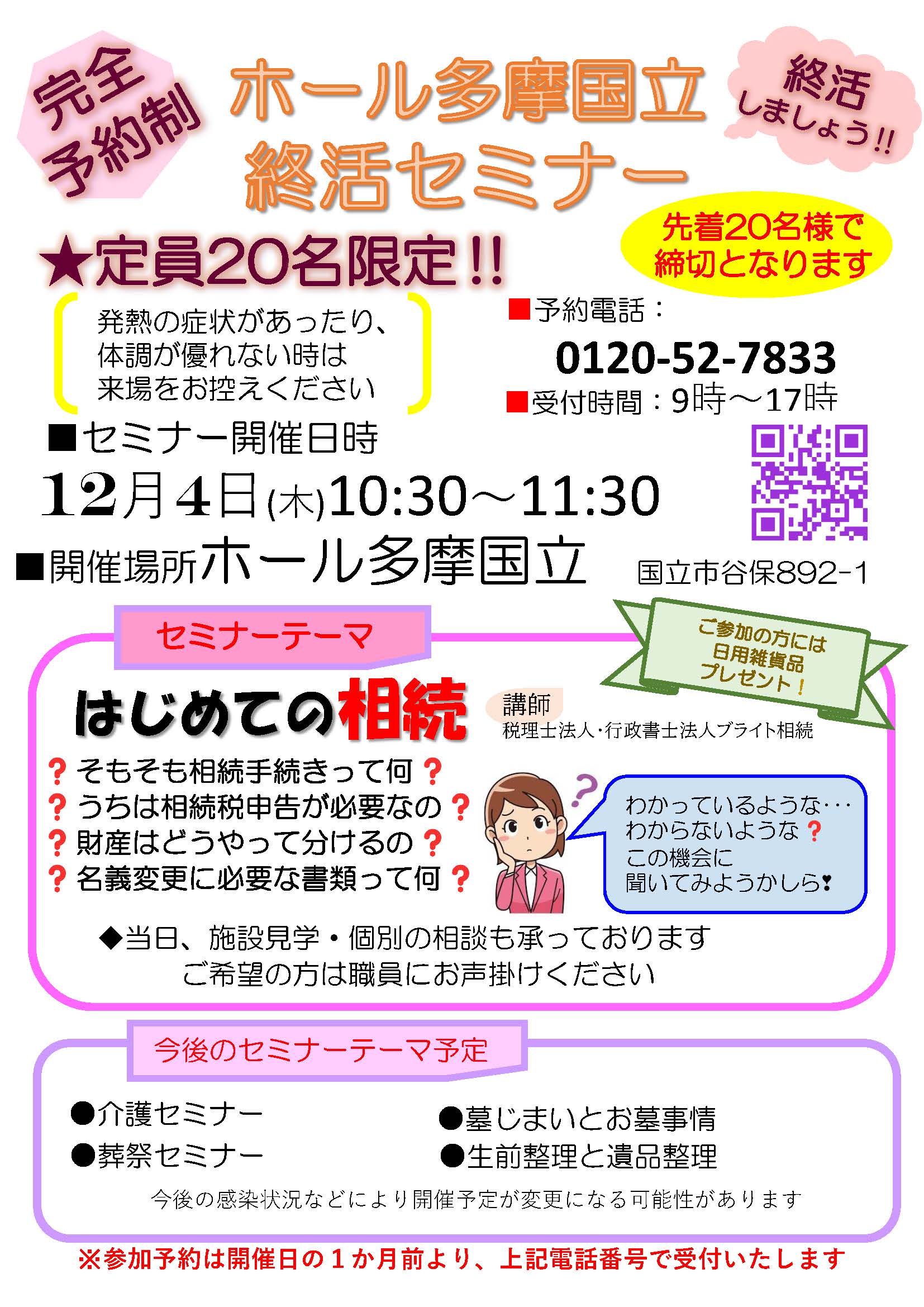 2025年12月4日(木) ホール多摩国立 はじめての相続 開催情報 日時2025年12月4日(木)10:00~11:00 会場ホール多摩国立 参加条件どなた様でもご参加いただけます。 定員【要予約】定員20名様で締め切りとさせていただきます。 予約電話0120-52-7833 受付時間9:00~17:00 備考定員20名限定/参加費無料 セミナー内容 そもそも相続手続きって何? うちは相続税申告が必要なの? 財産はどうやって分けるの? 名義変更に必要な書類って何? ご参加いただいた方には日用雑貨品をプレゼント! 開催チラシ チラシPDFをダウンロード 当日、施設見学・個別の相談も承っております。 ご希望の方は職員にお声かけください。 いざという時のために事前のご相談・見積作成をしてみませんか? ※今後のコロナウイルス感染状況などにより開催予定が変更になる可能性があります。