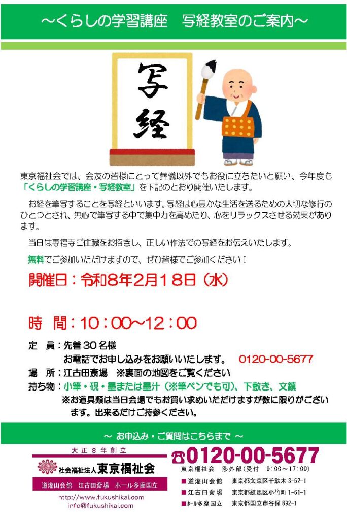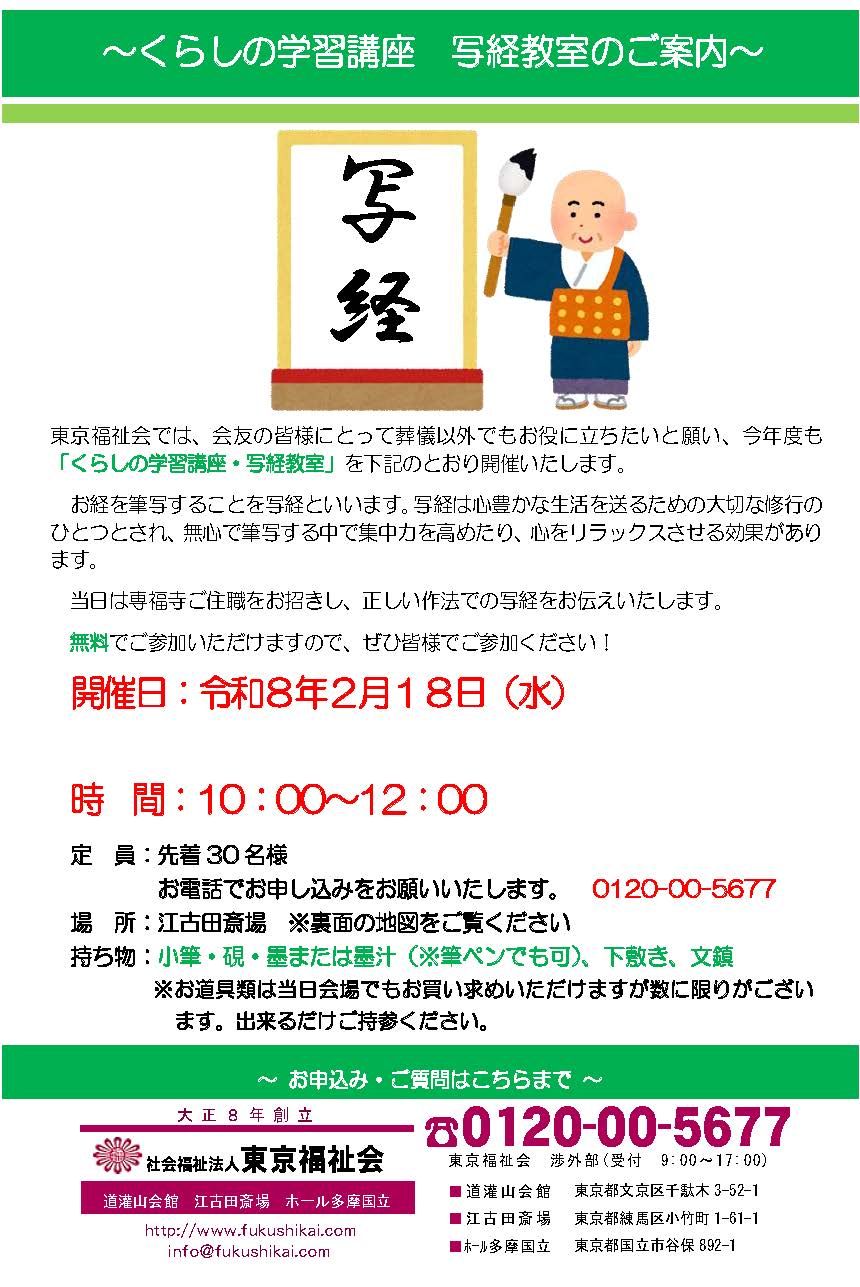 2026年2月18日(水) 江古田斎場 写経教室 講師:専福寺ご住職 開催情報 日時2026年2月18日(水)10:00~12:00 会場江古田斎場 参加条件会友加入の方 予約電話0120-00-5677 受付時間9:00~17:00 備考参加費無料 くらしの学習講座内容 コロナ禍で中止しておりました会友向け「くらしの学習講座」写経教室を再開いたします。 「写経」は功徳を積むための修行として広まりました。一文字ずつ集中して写していくことで心が落ち着き、浄められていくとされています。 ※お持ちいただくもの・・・小筆、硯、墨(墨汁可)、下敷き、文鎮 当日、道具の販売もありますが、数に限りがございますので、なるべく道具はご持参ください。筆や硯の代わりに筆ペンでも参加いただけます。 開催チラシ チラシPDFをダウンロード ※今後のコロナウイルス感染状況などにより開催予定が変更になる可能性があります。 《江古田斎場》は社会福祉法人が運営する葬儀社です。 (直営式場のため他葬儀社施行は不可) 練馬区にお住まいの方は『練馬区指定葬儀場助成制度』適用の対象です。 ■西武池袋線『江古田駅』北口徒歩2分 ■大・小規模各2式場 ■安置設備有 ■駐車場約30台 ■少人数の家族葬から大規模葬までご希望に沿ったご葬儀を施行 ■バリアフリー完備