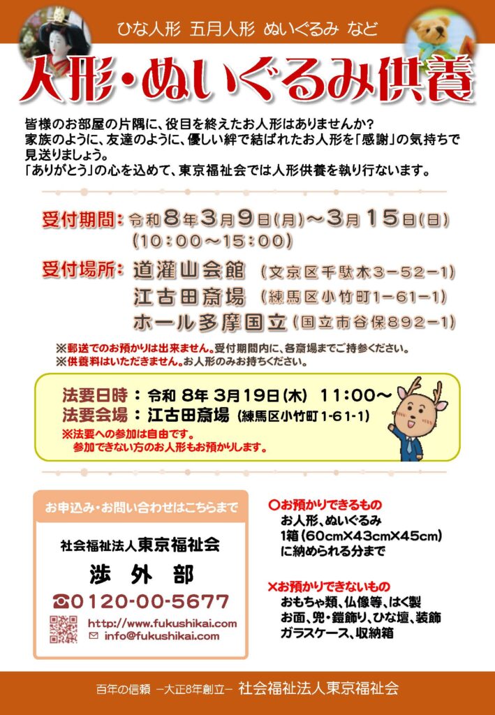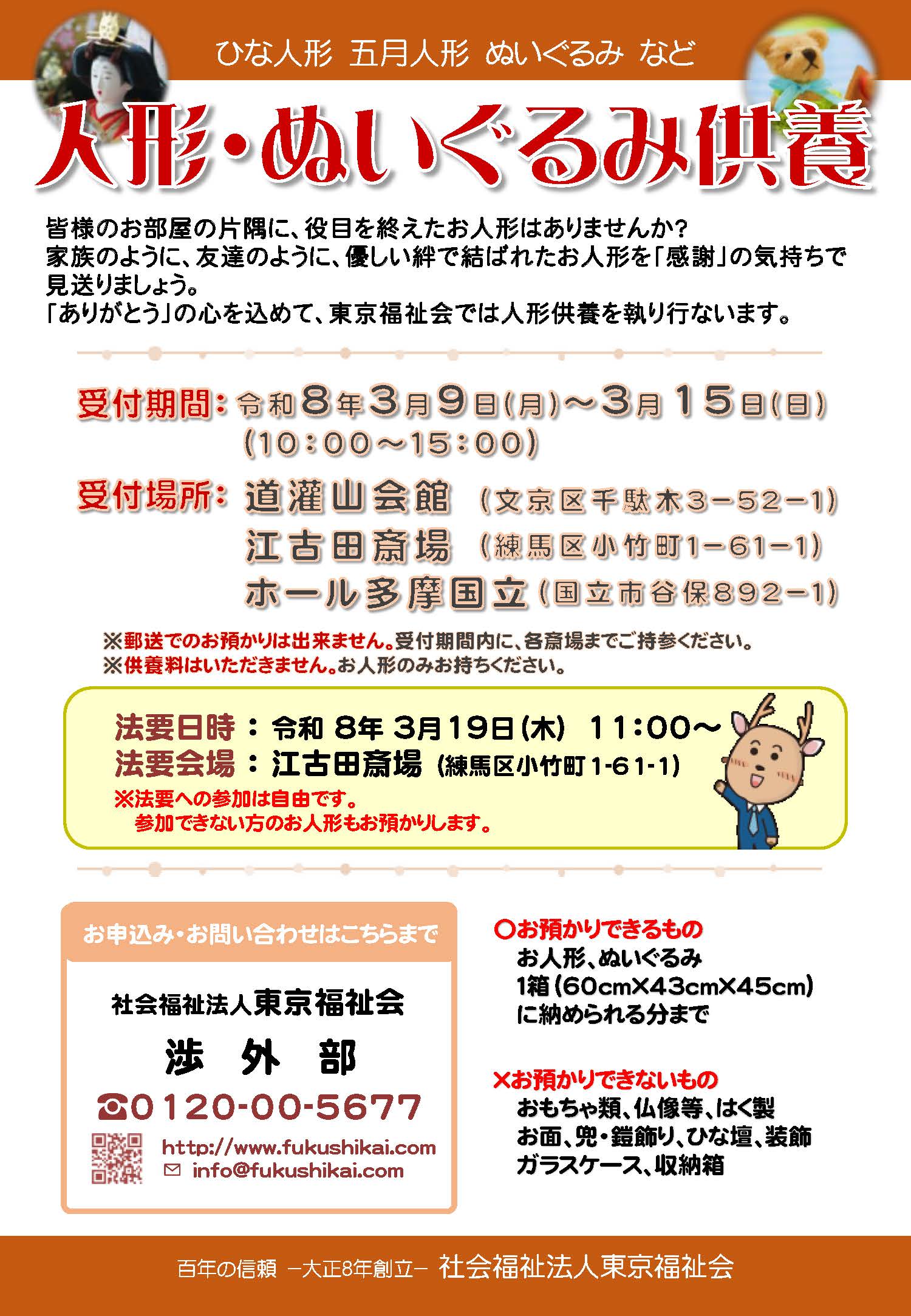 2026年3月19日(木) 江古田斎場 人形・ぬいぐるみ供養 開催情報 日時2026年3月19日(木)11:00~12:00 会場江古田斎場 予約電話0120-00-5677 催事内容 皆様からお預かりしたお人形達を、僧侶の読経によりご供養いたします。 ※お人形・ぬいぐるみは、法要にご出席いただけなくてもお預かりいたします。 人形・ぬいぐるみお預り期間 3月9日(月)~3月15日(日) 10:00~15:00 道灌山会館・江古田斎場・ホール多摩国立(当会直営斎場)までご持参ください。 ※郵送によるお預かりは行っておりません。 ※お預かりの際、供養料はいただいておりません。 開催チラシ チラシPDFをダウンロード ※今後のコロナウイルス感染状況などにより開催予定が変更になる可能性があります。 《江古田斎場》は社会福祉法人が運営する葬儀社です。 (直営式場のため他葬儀社施行は不可) 練馬区にお住まいの方は『練馬区指定葬儀場助成制度』適用の対象です。 ■西武池袋線『江古田駅』北口徒歩2分 ■大・小規模各2式場 ■安置設備有 ■駐車場約30台 ■少人数の家族葬から大規模葬までご希望に沿ったご葬儀を施行 ■バリアフリー完備