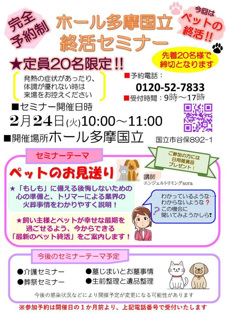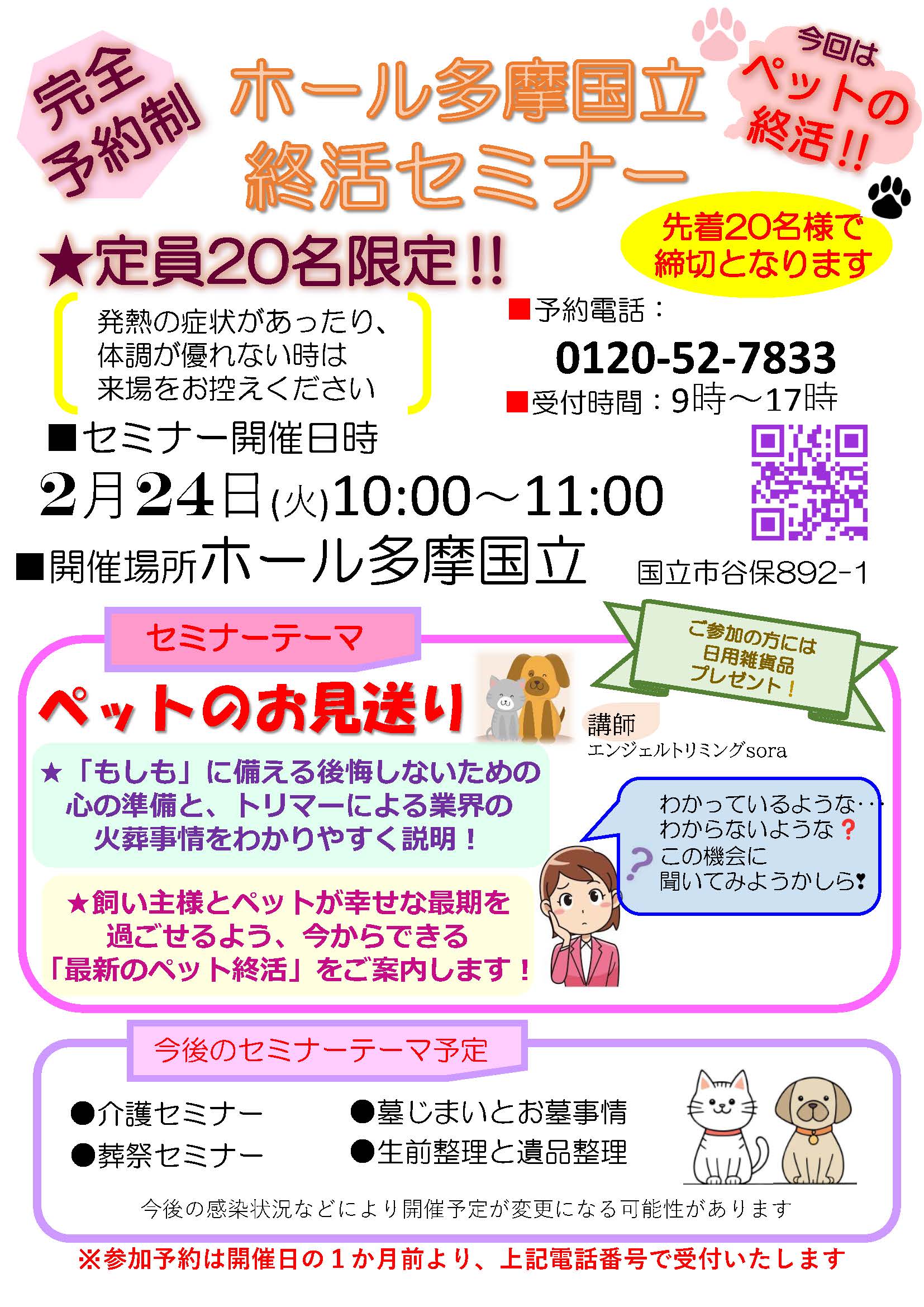 2026年2月24日(火) ホール多摩国立 心を込めた“ペットのおみおくり” 講師:エンジェルトリミング SORA 開催情報 日時2026年2月24日(火)10:00~11:00 会場ホール多摩国立 参加条件どなた様でもご参加いただけます。 定員【要予約】定員20名様で締め切りとさせていただきます。 予約電話0120-52-7833 受付時間9:00~17:00 備考定員20名限定/参加費無料 セミナー内容 「もしも」に備える後悔しないための心の準備と、トリマーによる業界の火葬事情をわかりやすく説明! 飼い主様とペットが幸せな最期を過ごせるよう、今からできる「最新のペット終活」をご案内します! 開催チラシ チラシPDFをダウンロード 当日、施設見学・個別の相談も承っております。 ご希望の方は職員にお声かけください。 いざという時のために事前のご相談・見積作成をしてみませんか? ※今後のコロナウイルス感染状況などにより開催予定が変更になる可能性があります。