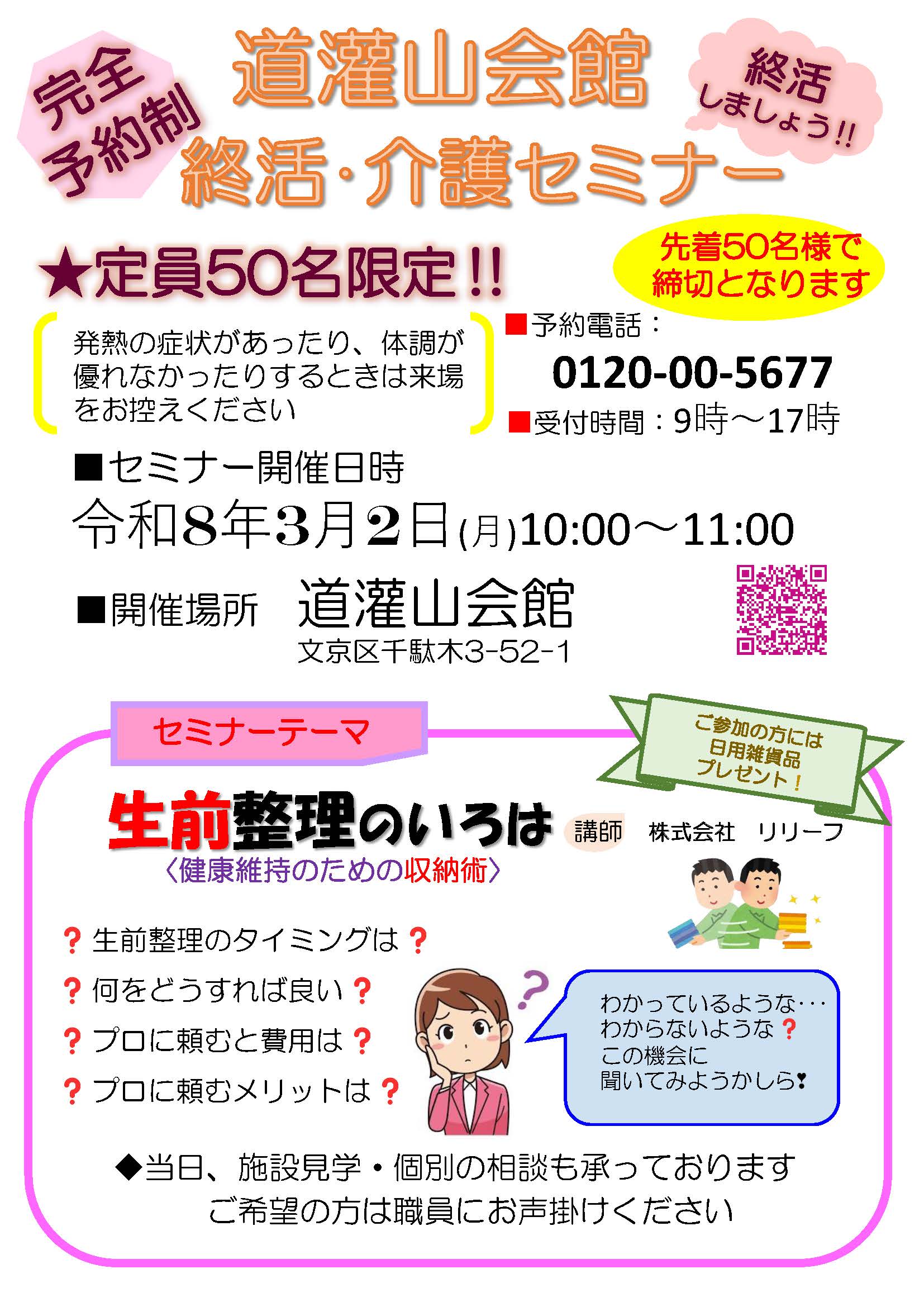 2026年3月2日(月) 道灌山会館 生前整理のいろは~健康維持のための収納術~ 講師:株式会社リリーフ 開催情報 日時2026年3月2日(月)10:00~11:00 会場道灌山会館 参加条件どなた様でもご参加いただけます。 定員【要予約】定員50名様で締め切りとさせていただきます。 予約電話0120-00-5677 受付時間9:00~17:00 備考定員50名限定/参加費無料 セミナー内容 生前整理のタイミングは? 何をどうすれば良い? プロに頼むと費用は? 整理収納アドバイザー1級・クリンネスト1級の資格を持つ講師が、思い出の品や日用品の整理法、 不要な物の手放し方などを丁寧かつわかりやすくお伝えします。 ご参加いただいた方には日用雑貨品をプレゼント! 開催チラシ チラシPDFをダウンロード 当日、施設見学・個別の相談も承っております。 ご希望の方は職員にお声かけください。 いざという時のために事前のご相談・見積作成をしてみませんか? ※今後のコロナウイルス感染状況などにより開催予定が変更になる可能性があります。 《道灌山会館》は社会福祉法人が運営する葬儀社です。 (直営式場のため他葬儀社施行は不可) ■西日暮里駅(徒歩7分)■大・小規模2式場 ■安置設備有 ■駐車場5台 ■少人数の家族葬から大規模葬までご希望に沿ったご葬儀を施行 ■バリアフリー完備